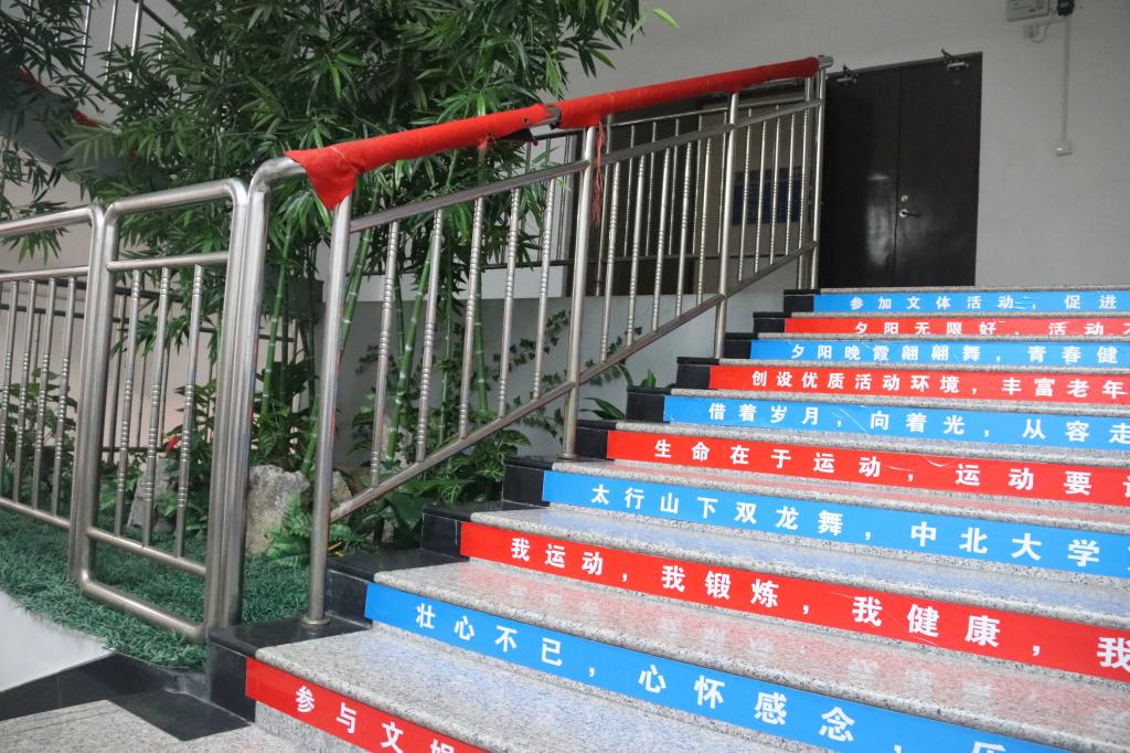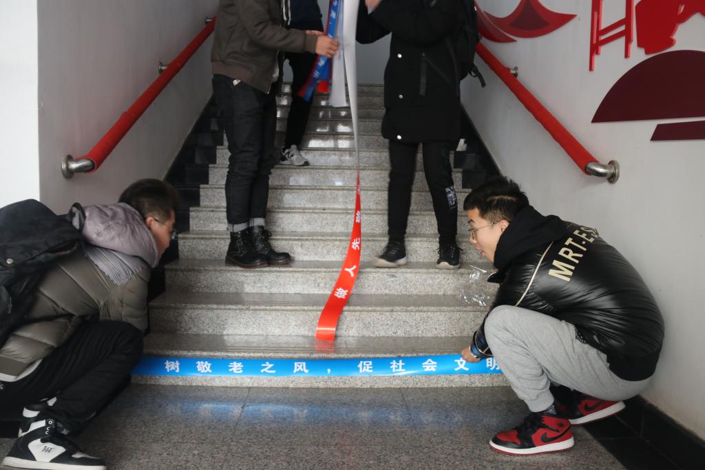 志愿活动由学院党建办公室和青志部联合开展,经过前期征集标语,筛选标语,广泛宣传动员等环节,活动正式开始。首先离退休人员管理处韩文剑老师做动员讲话,随后志愿者们开始工作,大家分工明确,各司其职,将标语整齐美观的张贴在67层台阶上。标语体现了离退休处“尊老爱老敬老”,“老有所养,老有所乐”以及“发挥预热,增添正能量”的工作、服务理念。