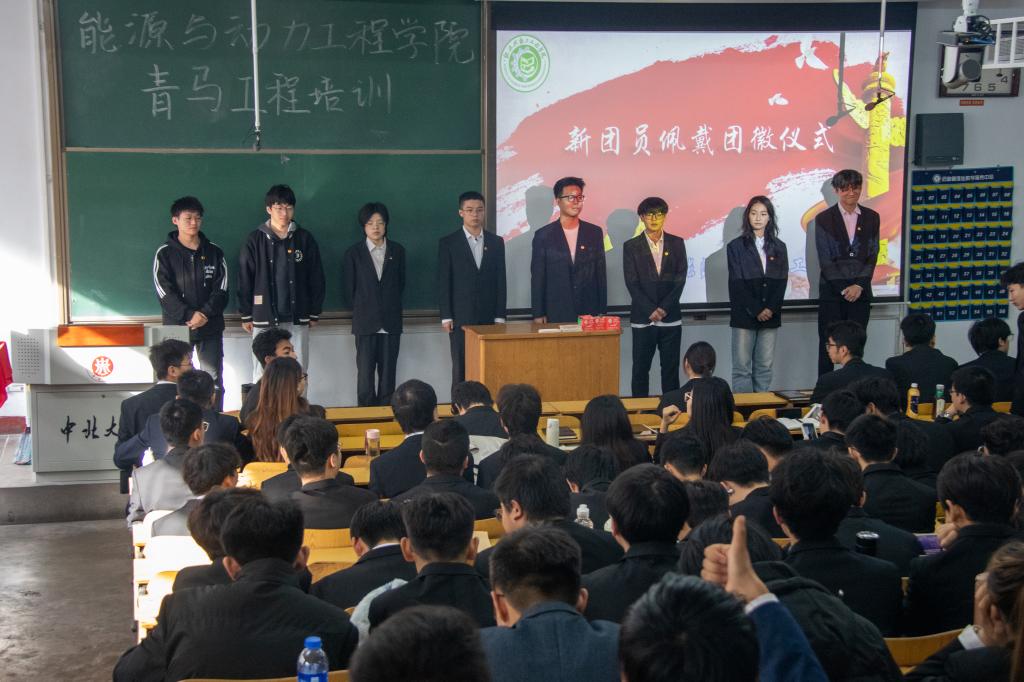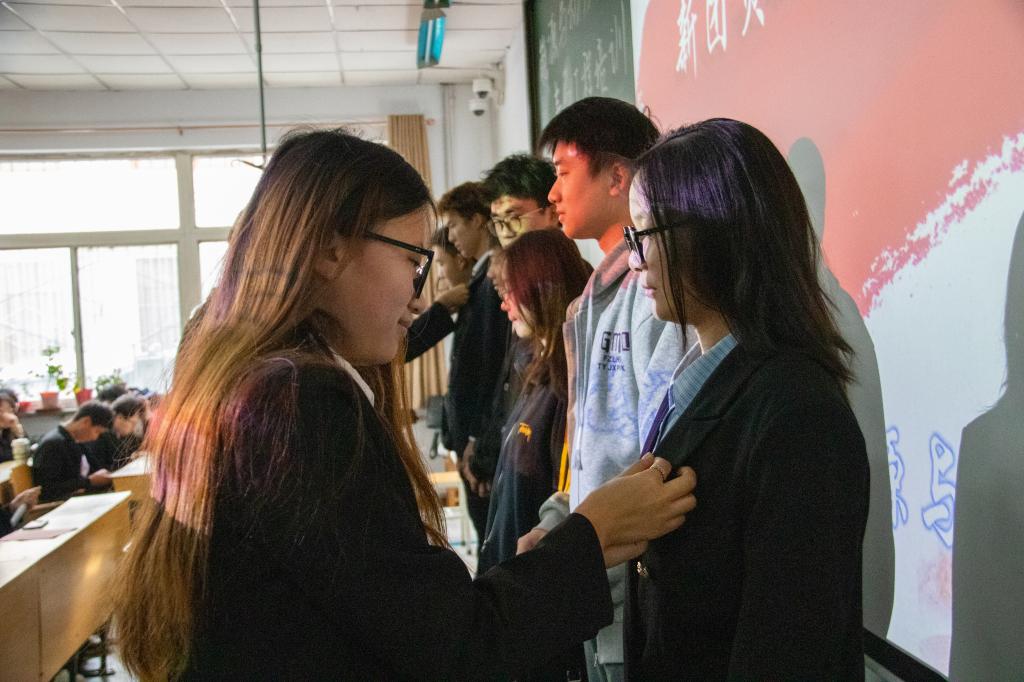 会议在同学们洪亮的团歌中开场,随后由团委,学生会等部门多位学生骨干为各位新入团的同学佩戴团徽。团徽虽小,却承载着沉甸甸的责任与使命。全体新团员佩戴崭新的团徽后,意气风发,展现着青春换发,信念坚定,志存高远的蓬勃活力。佩戴团徽后,意味着他们从此将紧密团结在党的周围,相信在未来他们也会以更加饱满的热情和坚定的信念,投入到学习和生活中去。