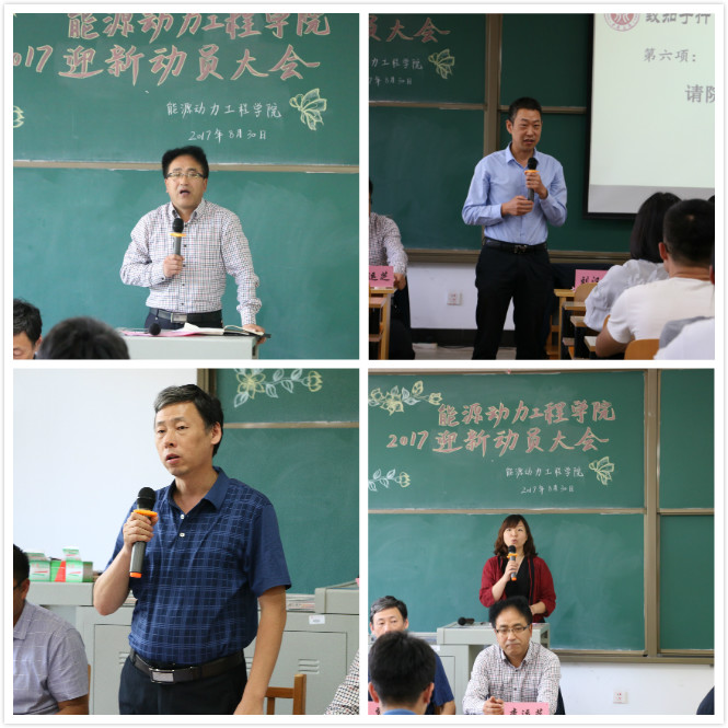 首先党委副书记赵永娟老师对能源动力工程学院2017年迎新工作做整体安排;副院长张翼老师就研究生迎新工作做了具体安排;随后学生干部代表王茜同学发言表示一定会以饱满的热情和态度做好迎新工作;院长刘汉涛老师强调迎新学生要展现积极向上的精神风貌,向新生传递正能量;院长党委书记李运芝老师做动员讲话希望同学们能克服困难,牢记责任意识,提高执行力,全面做好能源动力工程学院的迎新工作。最后,百名学生干部举起右拳,庄严宣誓,保证圆满完成2017年迎新工作。