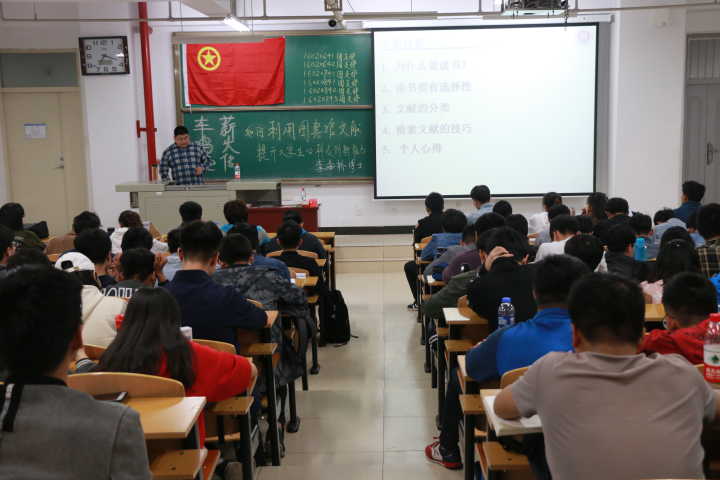 本周五晚,大二的六个班来了一次大集会,大二的同学们坐满了15106教室。这正是本次的联合团日活动《车鸣起 薪火传 如何利用图书馆文献资料提高大学生的科技创新能力》讲座现场!