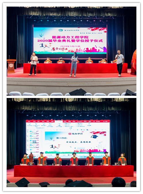 典礼在快闪歌曲《北京东路的日子》中拉开了序幕,全场齐声高唱国歌,爱国之情洋溢其中。首先,院长刘汉涛致辞,他希望毕业生能够树立崇高理想,继续学习,投身实践,毋忘母校,在今后各自的岗位上一路高歌,大展宏图,驰骋人生。副院长胡胜亮、车辆与汽服系主任杨世文、动力工程及工程热物理系李世民分别宣读了2020届校友联络员、校优秀毕业生和院优秀毕业生的名单,主席台领导为获得各项荣誉的毕业生颁发荣誉证书和聘书。