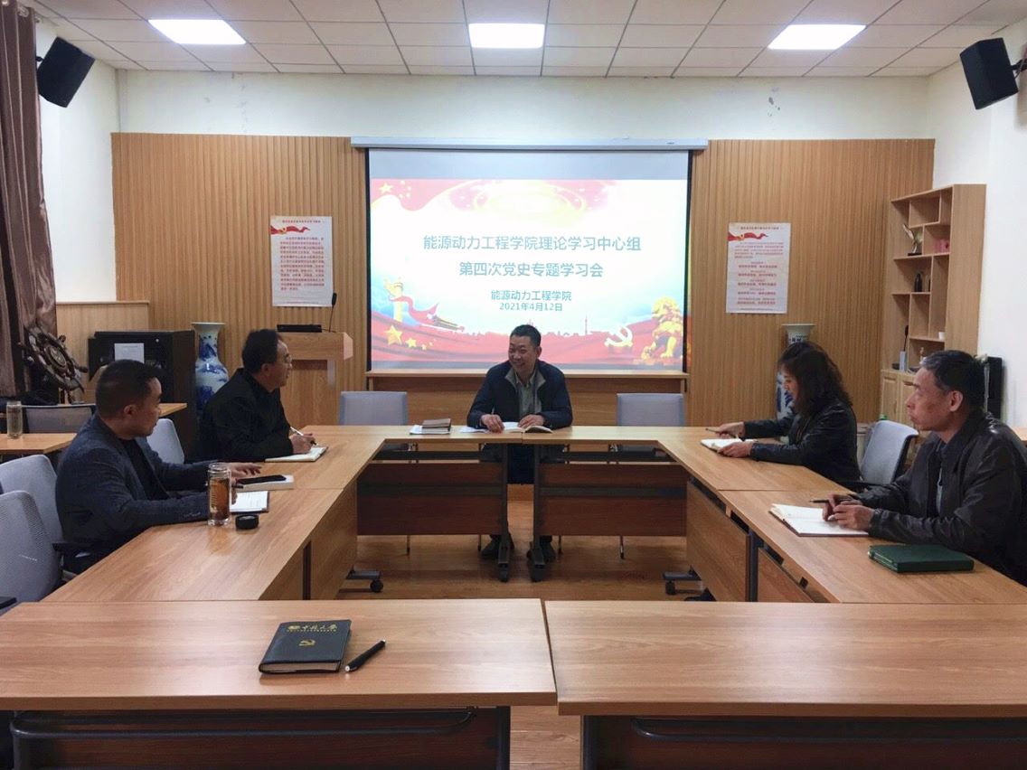 2021年4月12日下午,能源动力工程学院党委在诚学楼115会议室召开党委理论学习中心组第四次党史专题学习会。学院领导班子全体成员参加了会议,本次学习会由院长刘汉涛同志领学。