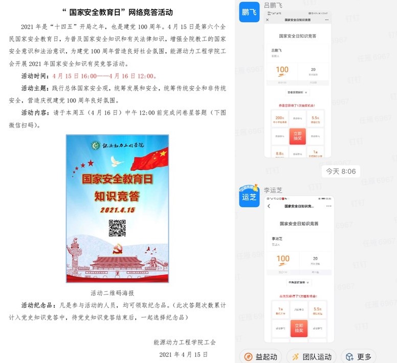 2021年4月15日是第六个全民国家安全教育日,为普及国家安全知识和有关法律知识,增强全院教工的国家安全意识和法治意识,为建党100周年营造良好社会氛围,能源动力工程学院工会开展“共筑安全防线,维护国家安全”网络知识竞答活动。全院65名教职工通过在线答题的方式参加了知识竞答活动。