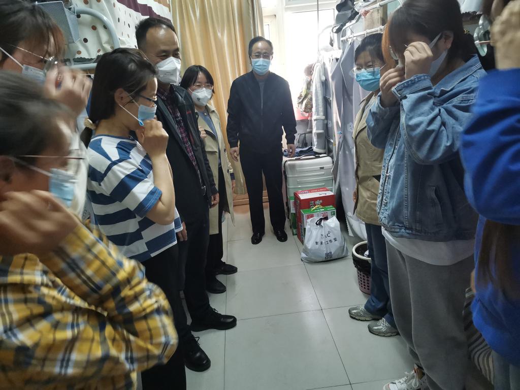 文瀛16号楼的6名女研究生牺牲“小我”护“大局”,别离“旧舍”迁“新居”。4月10日上午,学院党委书记李运芝、导师常青、学生科科长叶增民、研究生辅导员祁亚萍等一行专程来到她们的新居——文瀛10号楼,看望慰问从16号楼搬离的研究生,为她们送上牛奶、方便面、饼干等慰问品,也带去了全院教师的温暖问候和衷心感谢。李运芝书记每到一个宿舍,都仔细询问同学们的学习、生活、身体健康状况,与同学们分享自己抗疫的经历和感受,对同学们做出“舍小家为大家”的决定表示高度赞扬。同时,李书记也叮嘱班主任和研究生导师要为学生提供有效的服务保障,及时解决实际问题,时刻关注她们的情绪变化,做好心理疏导。导师常青要求同学们做好个人防护,遵守学校疫情防控各项规定,并鼓励研究生们保持积极向上的心态,用勤奋和刻苦为青春增色添彩。