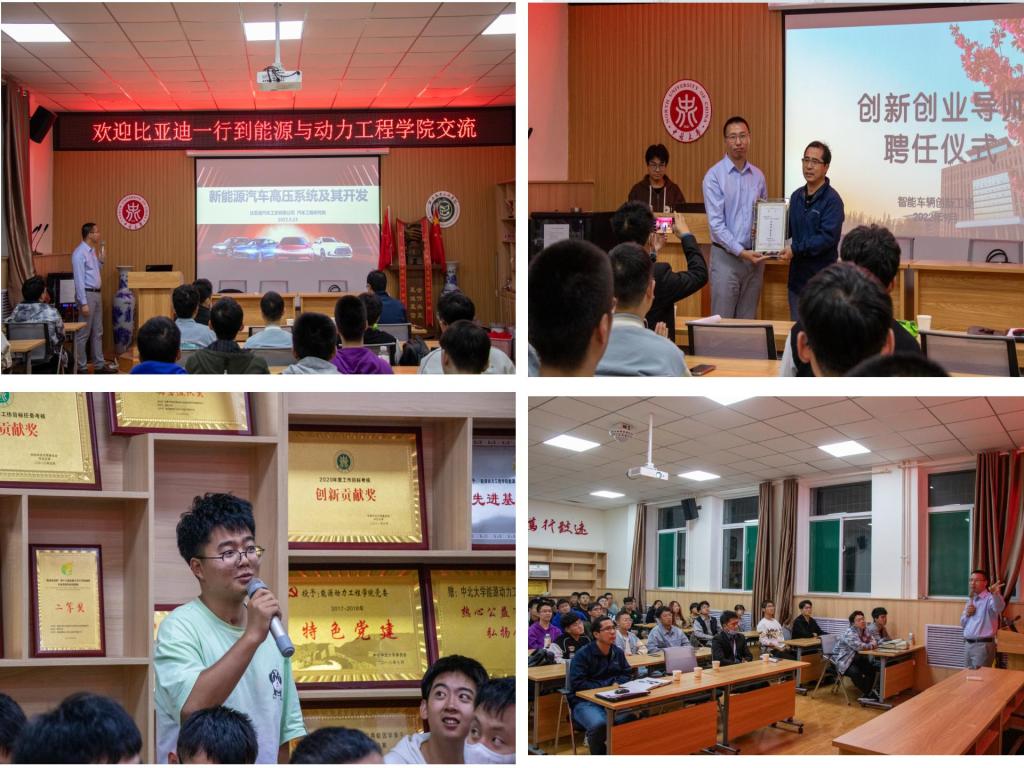 交流会上,王宁经理从新能源汽车的发展历史入手,对电动汽车的高压系统、电驱动系统、动力电池系统以及电动汽车的性能开发等八个方面进行了重点讲解。讲解过程中,王经理播放了比亚迪电池安全测试领域的“珠穆朗玛峰”——针刺测试,极端强度测试──46吨重卡碾压测试等视频,帮助同学们深度理解电动汽车的系统原理及产品。随后,王经理与现场同学热烈互动,就同学们感兴趣的技术问题、行业发展趋势、比亚迪招聘政策等问题进行了深度交流。