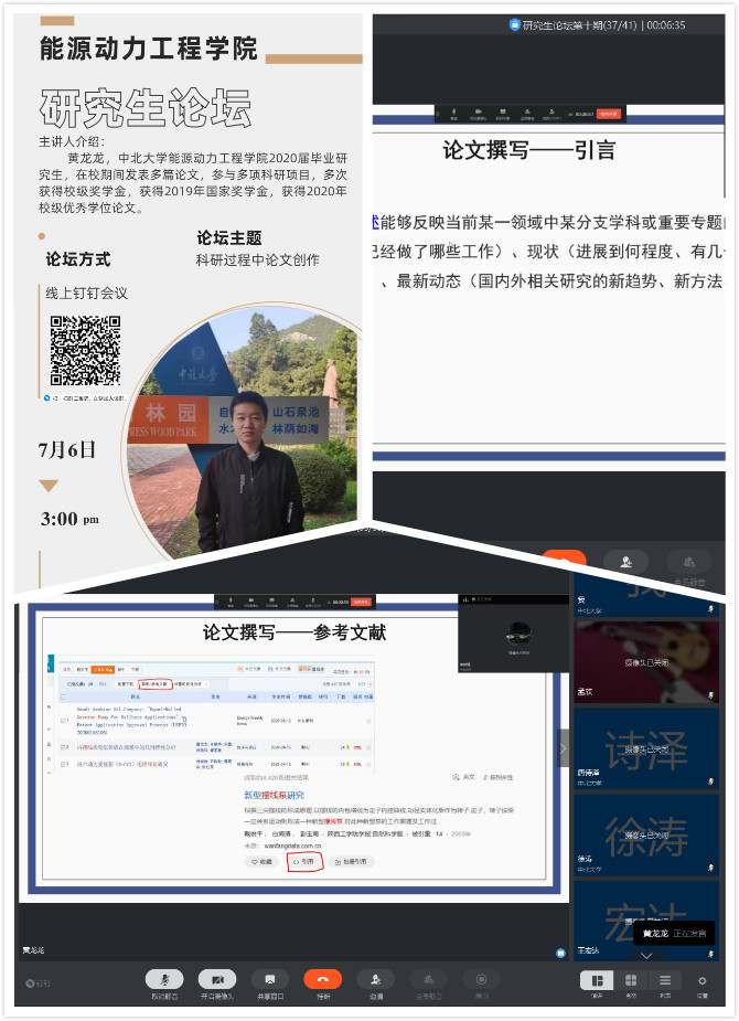 2019年研究生国家奖学金的获得者,在校期间发表多篇高水平论文,参与多项科研项目,其学位论文被评为2020年校级优秀学位论文。现就职于四川绵阳中国空气动力学研究与发展中心。黄龙龙同学结合自己三年科研写作过程中遇到的问题,介绍了写论文的“六步法则”, 并为同学们总结了详细的写作经验与写作技巧,分享了自己写论文的情绪管理,让大家不要对论文写作抱有畏难情绪,鼓励大家放松心态着手去做。最后,面对同学们的热情提问,黄龙龙同学也耐心地为大家解答,线上研究生论坛在活跃的气氛中圆满结束。