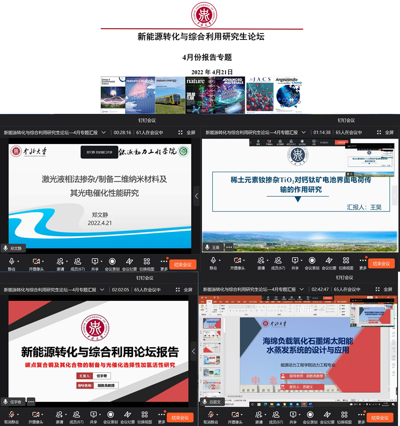 疫情之下,为促进研究生的培养、学术研究和交流,4月21日,能源动力工程学院举办的新能源转化与综合利用研究生论坛-4月份专题报告顺利在线上召开。会上邀请郑文静老师、王昊、任宇奇及苏居文就光电催化析氢与原位透射电镜、钙钛矿太阳能电池、光催化选择性加氢、太阳能水蒸发系统设计方面作了精彩汇报和学术交流。本次论坛中的报告主题鲜明、选题精准、研究深入、成果显著。三位研究生已在Green Chemistry、Journal of Materials Chemistry A、Carbon等SCI收录的TOP 1区期刊发表论文。本次研究生论坛为av在线看