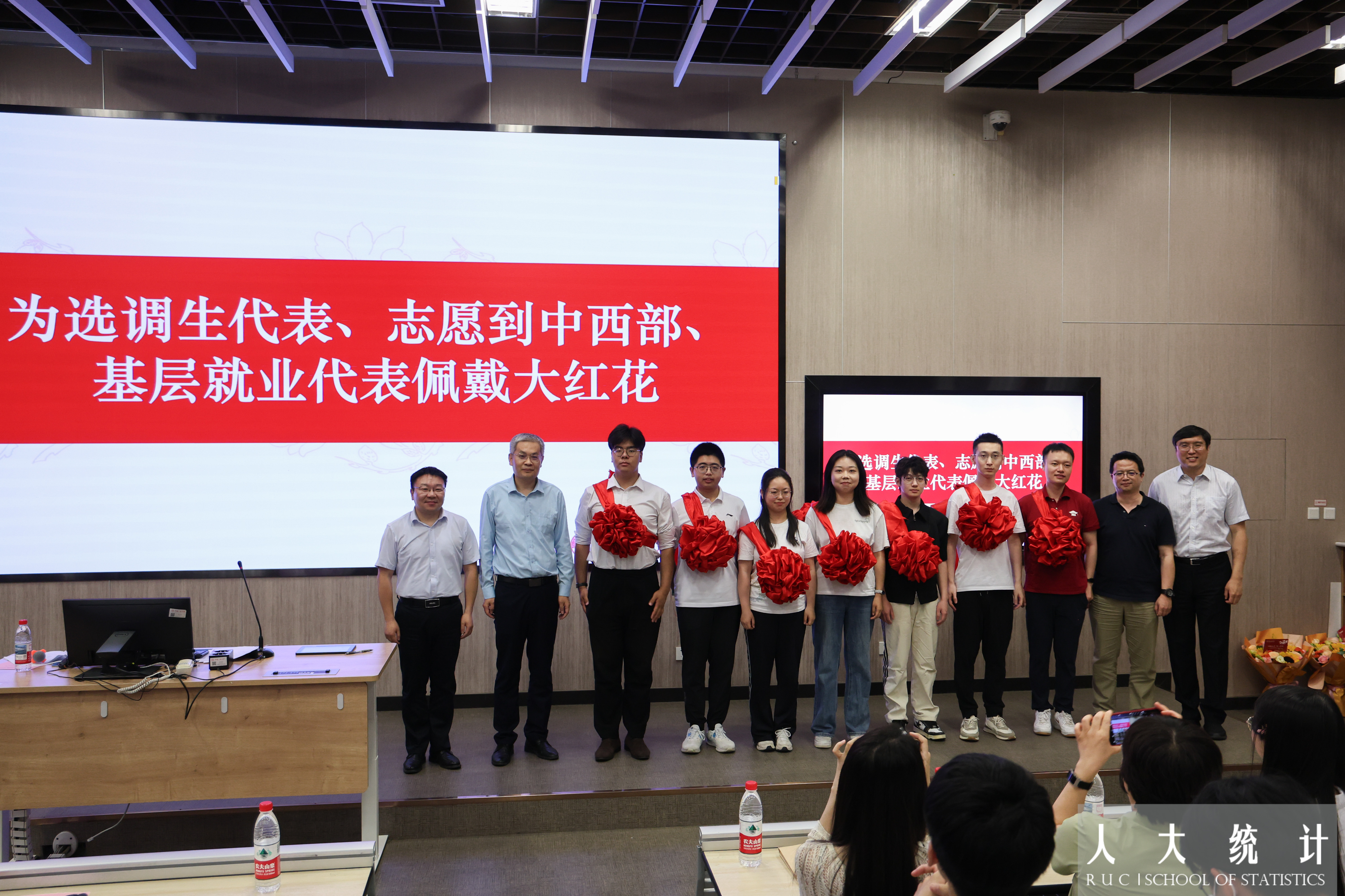 尹建鑫、王志丹为选调生代表、赴中西部地区和基层就业的毕业生代表佩戴大红花。