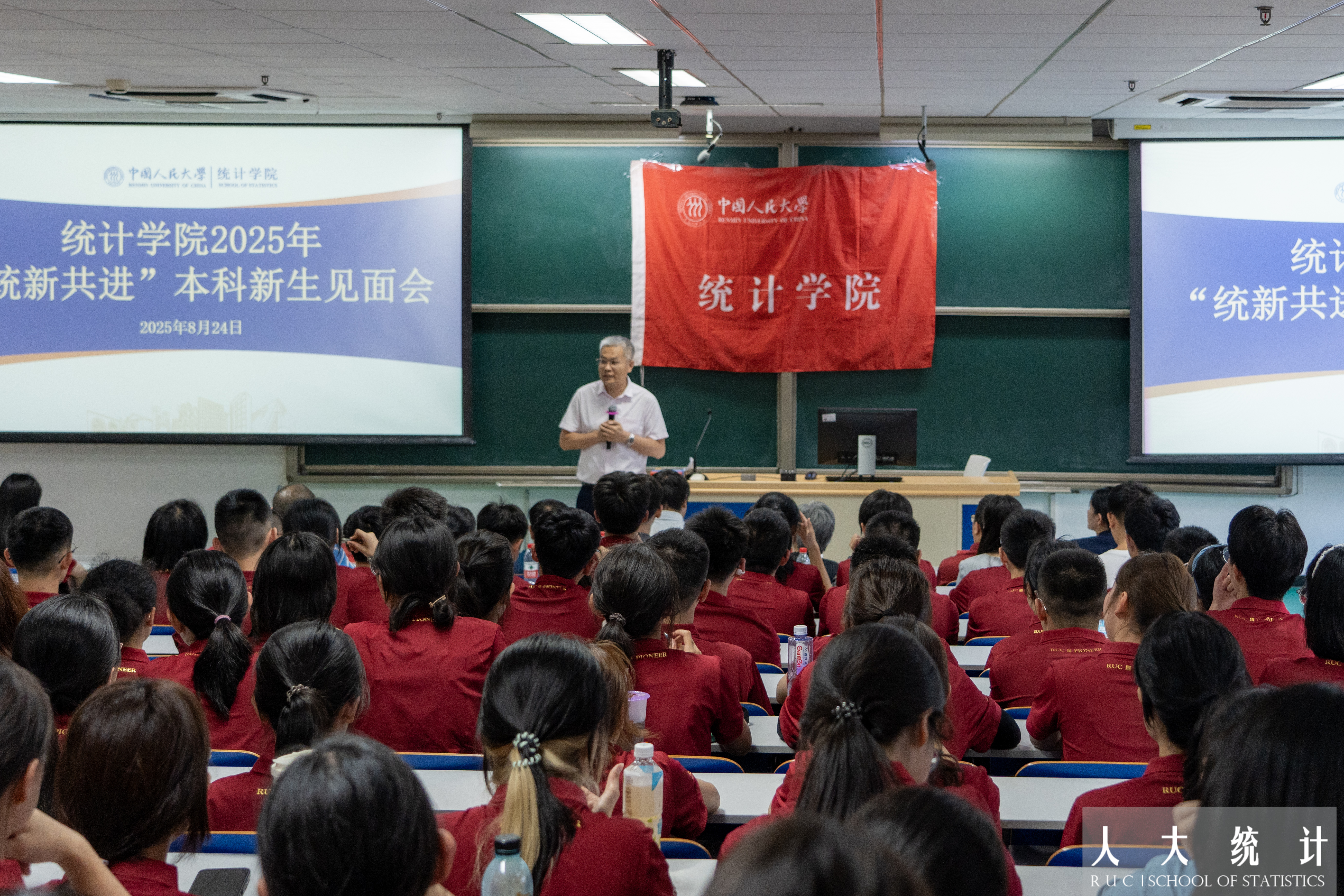 8月24日下午,av在线看 “统新共进”2025级本科新生见面会在公共教学一楼1205举行。av在线看 院长、党委副书记李扬,党委书记黄一顺,党委副书记王志丹,副院长尹建鑫、李静萍,av在线看 二级教授、关工委委员高敏雪出席会议。各系主任、办公室主任、新生班主任、专兼职辅导员,以及全体2025级本科新生近200人参加会议。见面会由黄一顺主持。