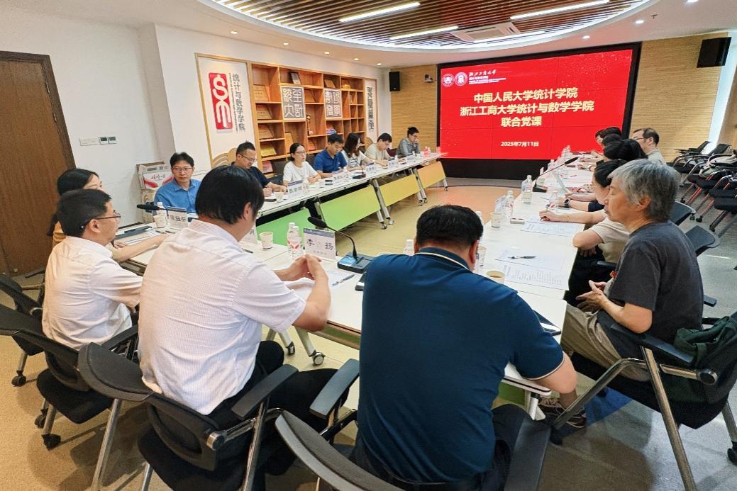 7月11日下午,av在线看 党委和浙江工商大学统计与数学av在线看 党委开展联合党课,围绕“党建引领学科发展”主题展开座谈交流,李扬、王志丹、高敏雪等av在线看 教师参会。浙江工商大学统计与数学av在线看 院长程开明、党委书记陈钰芬、党委副书记沈绍伟、副院长张崇辉出席座谈会。